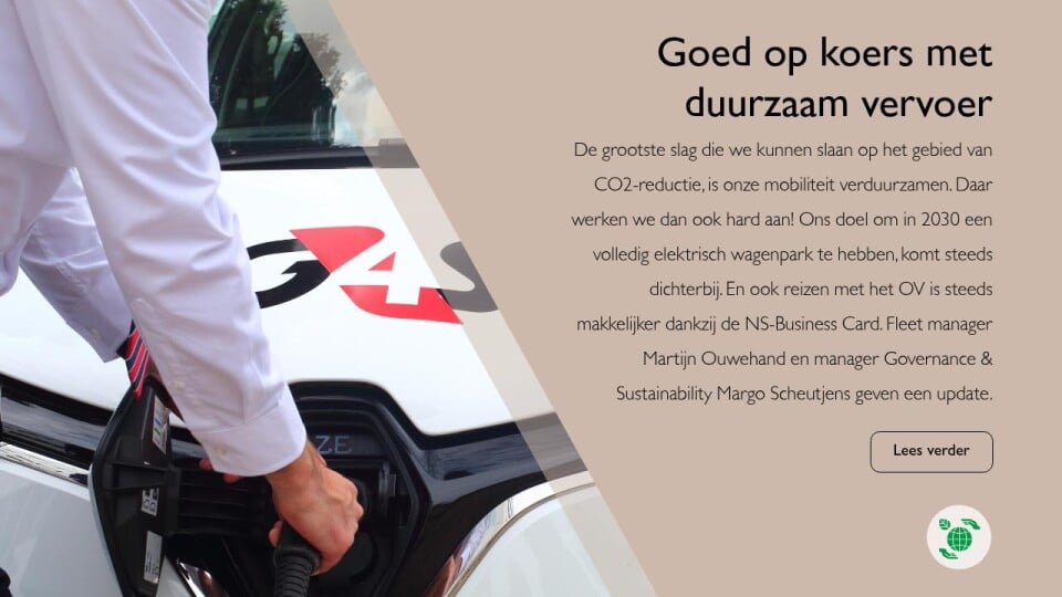 De grootste slag die we kunnen slaan op het gebied van CO2-reductie, is onze mobiliteit verduurzamen. Daar werken we dan ook hard aan! Ons doel om in 2030 een volledig elektrisch wagenpark te hebben, komt steeds dichterbij. En ook reizen met het OV is steeds makkelijker dankzij de NS-Business Card. Fleet manager Martijn Ouwehand en manager Governance & Sustainability Margo Scheutjens geven een update.